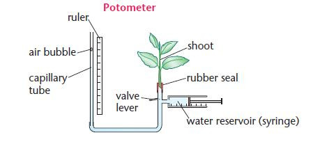 This is done indirectly by using a potometer. This instrument works on the following principle: for every molecule of water lost by transpiration, one is taken up by the shoot.