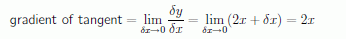 As we let dx become zero we are left with just 2x, and this is the formula for the gradient of the tangent at P. We have a concise way of expressing the fact that we are letting dx approach zero. We write