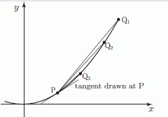 Consider the graph below which shows a fixed point P on a curve. We also show a sequence of points Q1, Q2, . . . getting closer and closer to P. We see that the lines from P to each of the Q’s get nearer and nearer to becoming a tangent at P as the Q’s get nearer to P.