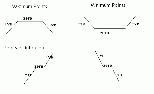 At maximum points, the gradient is positive just before the maximum, it is zero at the maximum and it is negative just after the maximum. At minimum points, the gradient is negative, zero then positive. Finally at points of inflexion, the gradient can be positive, zero, positive or negative, zero, negative. This is illustrated here: