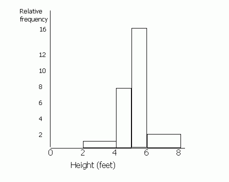 When drawing a histogram, the y-axis is labelled 'relative frequency' or 'frequency density'. You must work out the relative frequency before you can draw a histogram. To do this, first you must choose a standard width of the groups. Some of the heights are grouped into 2s (0-2, 2-4, 6-8) and some into 1s (4-5, 5-6). Most are 2s, so we shall call the standard width 2. To make the areas match, we must double the values for frequency which have a class division of 1 (since 1 is half of 2). Therefore the figures in the 4-5 and the 5-6 columns must be doubled. If any of the class divisions were 4 (for example if there was a 8-12 group), these figures would be halved. This is because the area of this 'bar' will be twice the standard width of 2 unless we half the frequency.